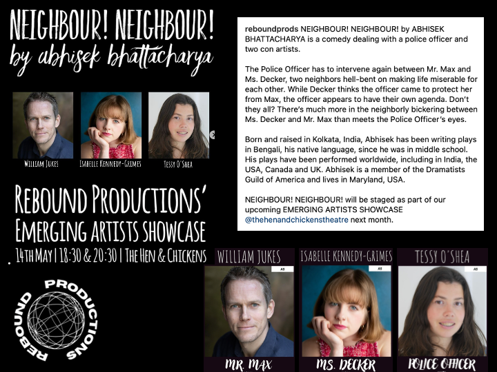 Abhisek Bhattacharya is an award-winning, internationally produced playwright with plays performed all over the world, including in India, the UK, Canada, and the USA. Abhisek is a member of the Dramatists Guild of America and lives in Maryland, USA.